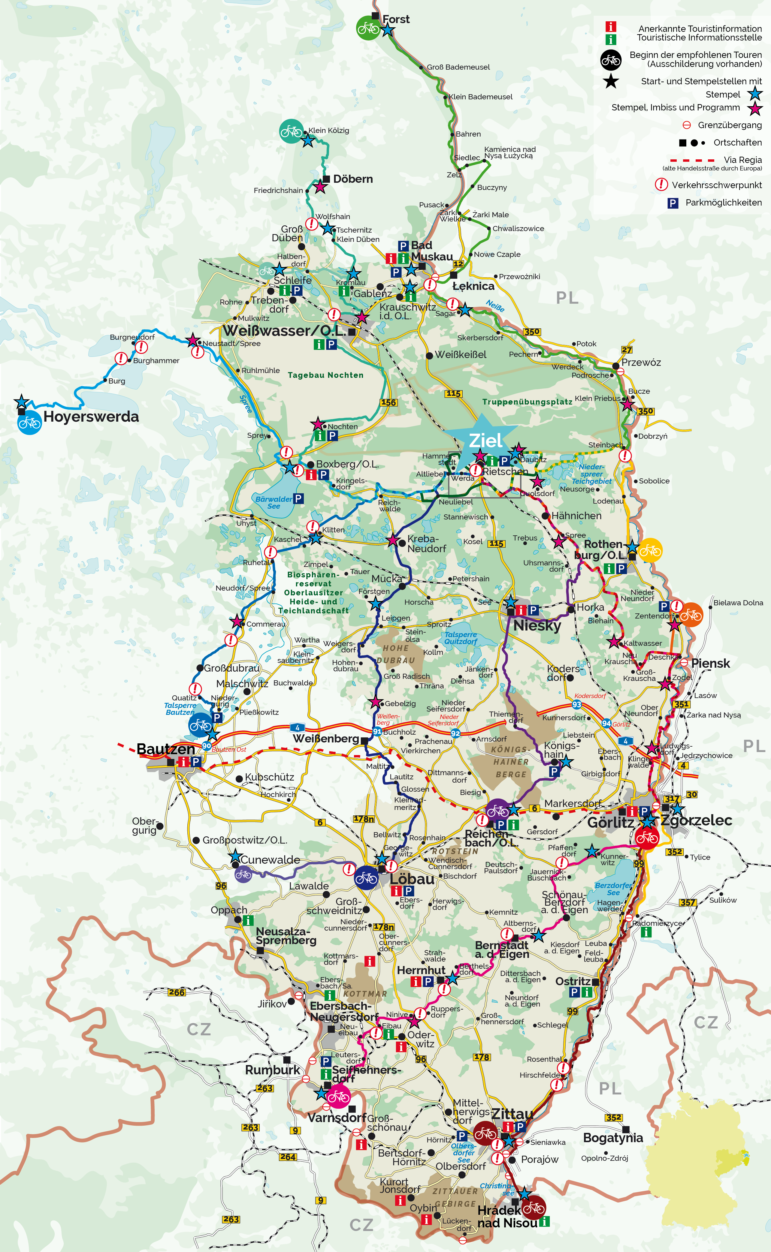 Neun Touren mit den Startpunkten Rumburk, Liberec, Oppach, Boxberg O.L.(mit Zubringer von Löbau bis Cunewalde), Rietschen (mit Zubringer von Reichenbach), Bad Muskau, Bautzen und Görlitz/ Zgorzelec sind für Sie mit dem Symbol der Sternradfahrt ausgeschildert und führen sternförmig zum